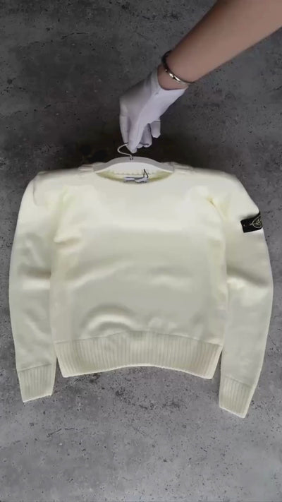 Crew neck sweater in lightweight RWS Geelong wool. Logo appliqué on the left sleeve. Plain knit. 12-gauge.